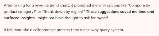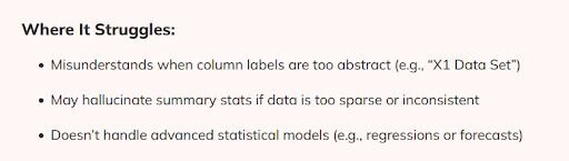 Lets you analyze data without writing SQL or code | Results can vary depending on how your data is structured and formatted |